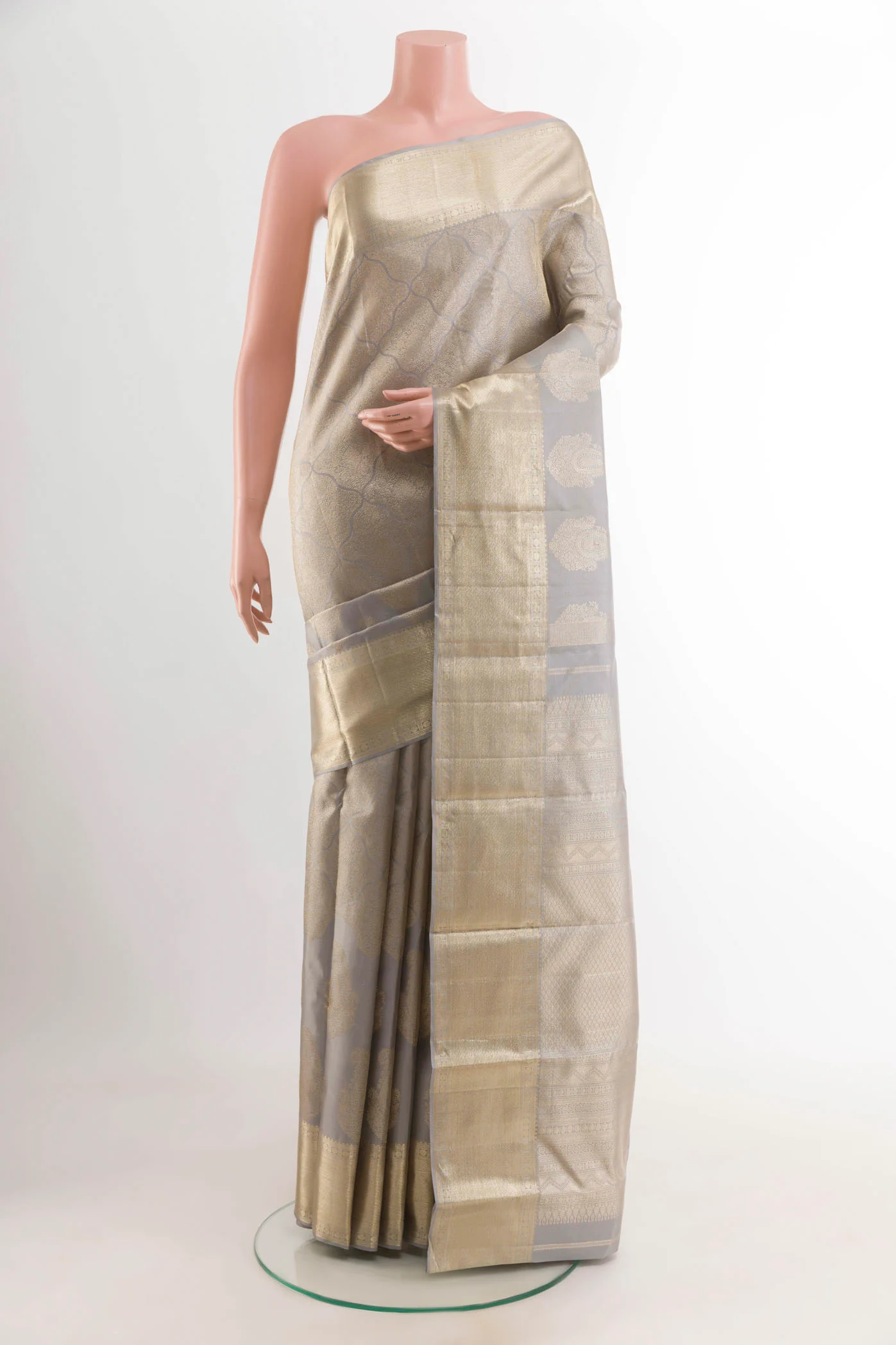 Grey Kanchipuram Silk Saree with Zari Butta on the body and Zari Border. Includes unstitched blouse.