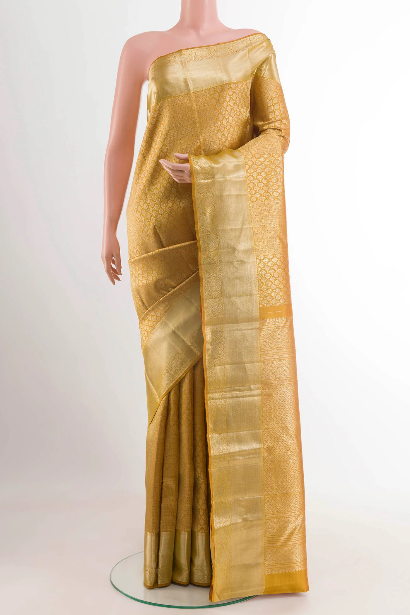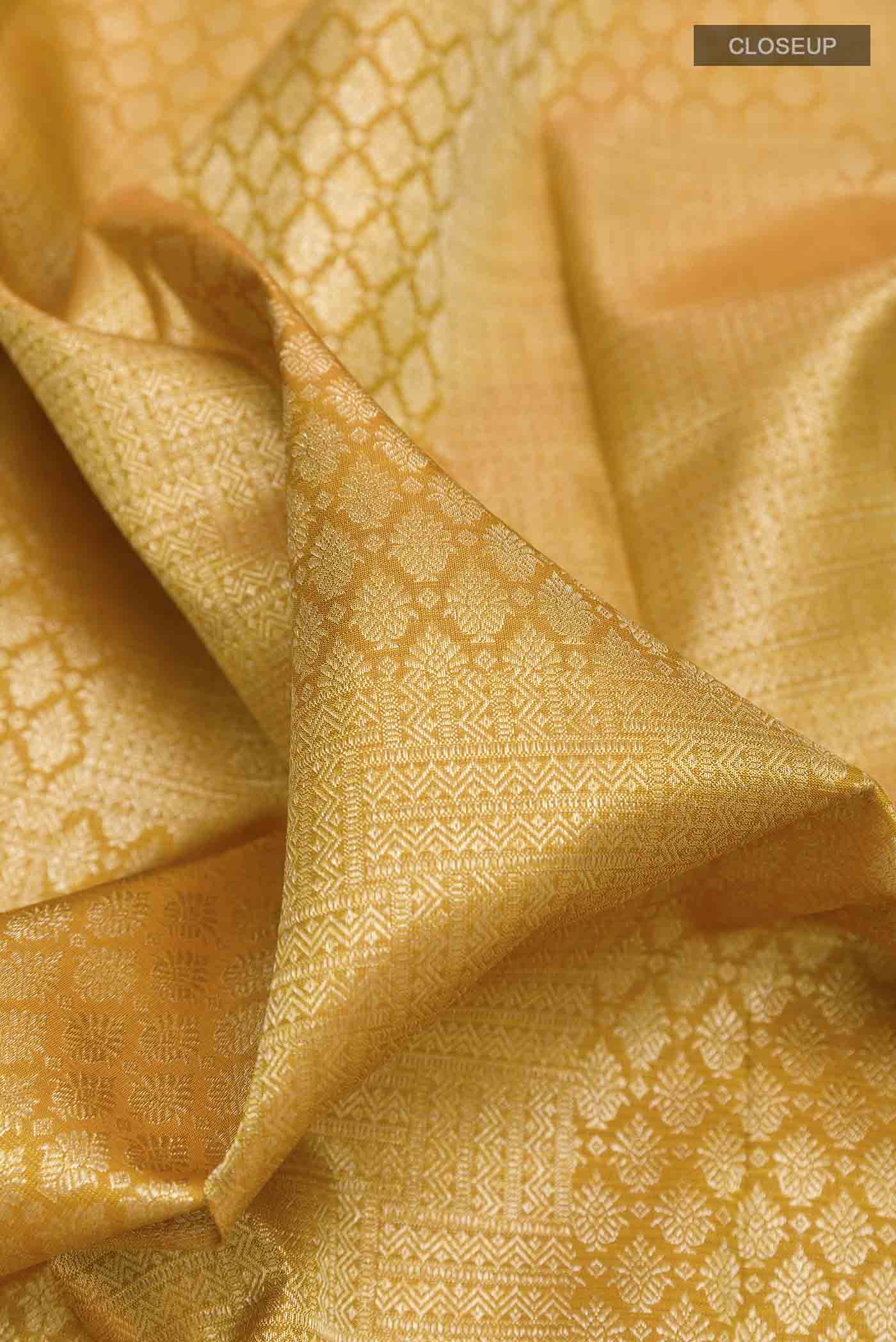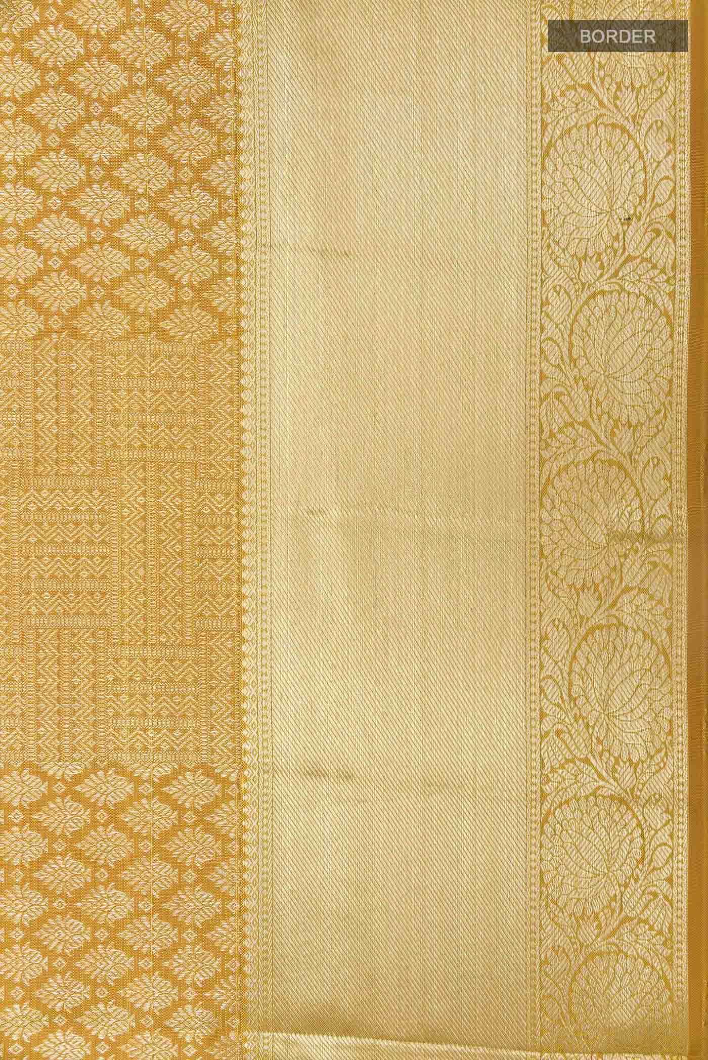 Mustard Kanchipuram Silk Saree with Zari Brocade on the body and Zari Border. Includes unstitched blouse.