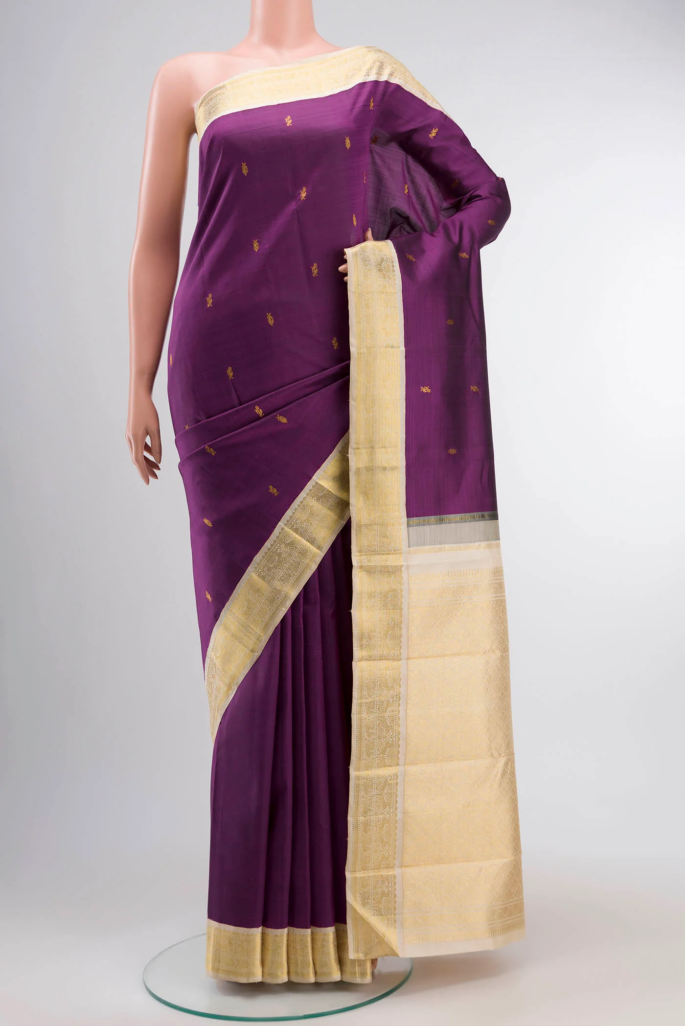 Purple Kanchipuram Silk Saree with Zari Butta on the body and Zari Border. Includes unstitched blouse.