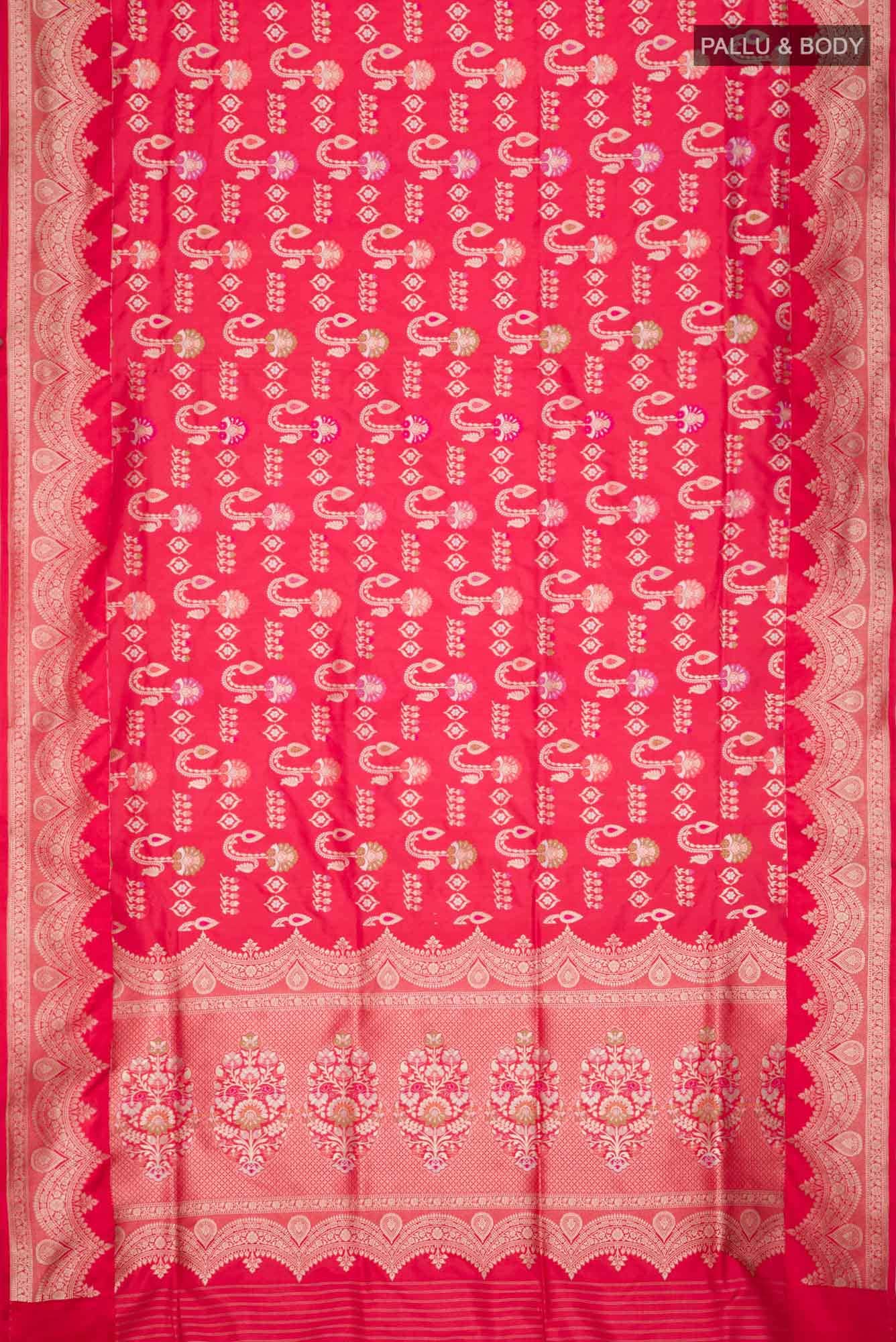 Red Banarasi Silk Saree with Zari Butta on the body and Zari Border. Includes unstitched blouse.
