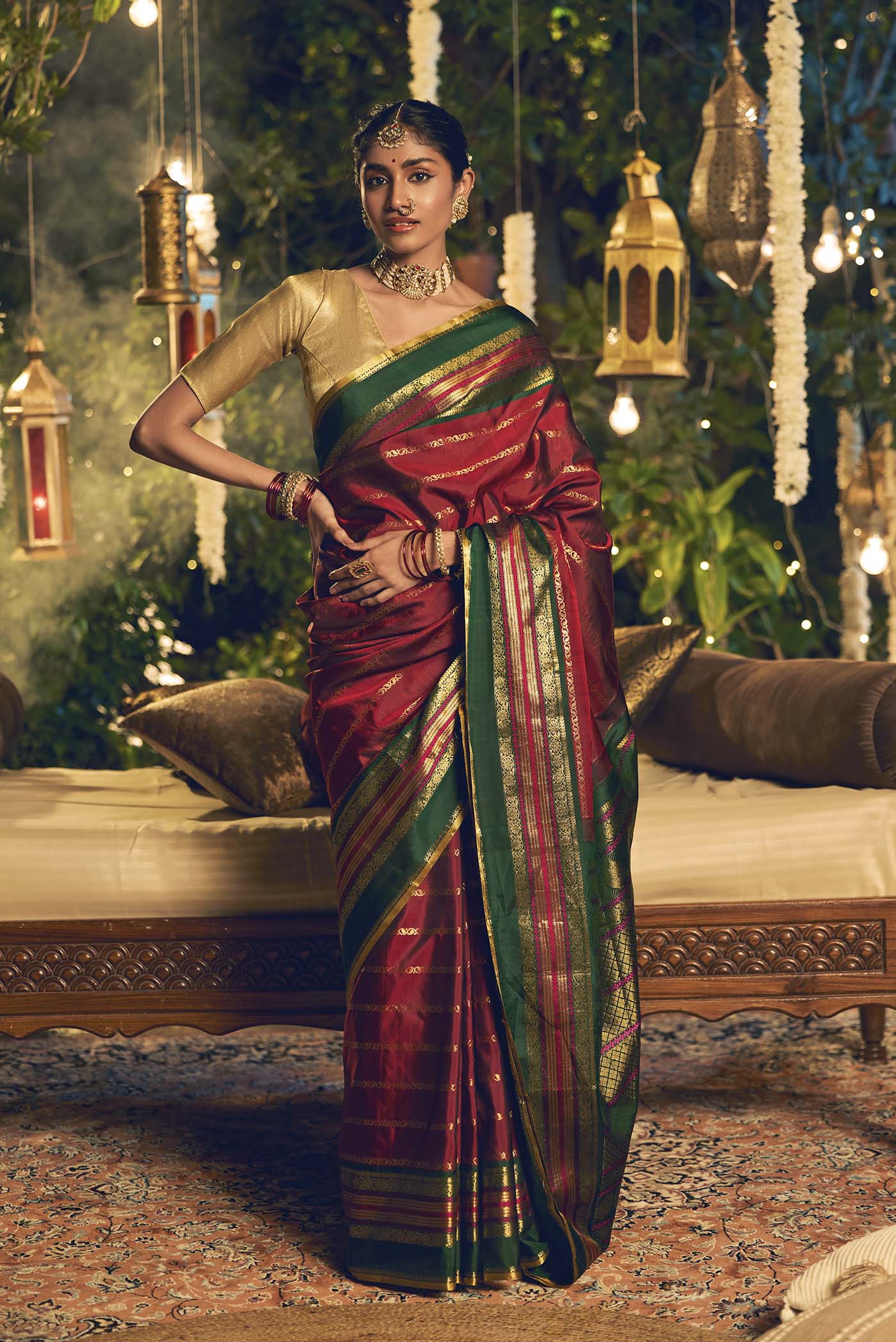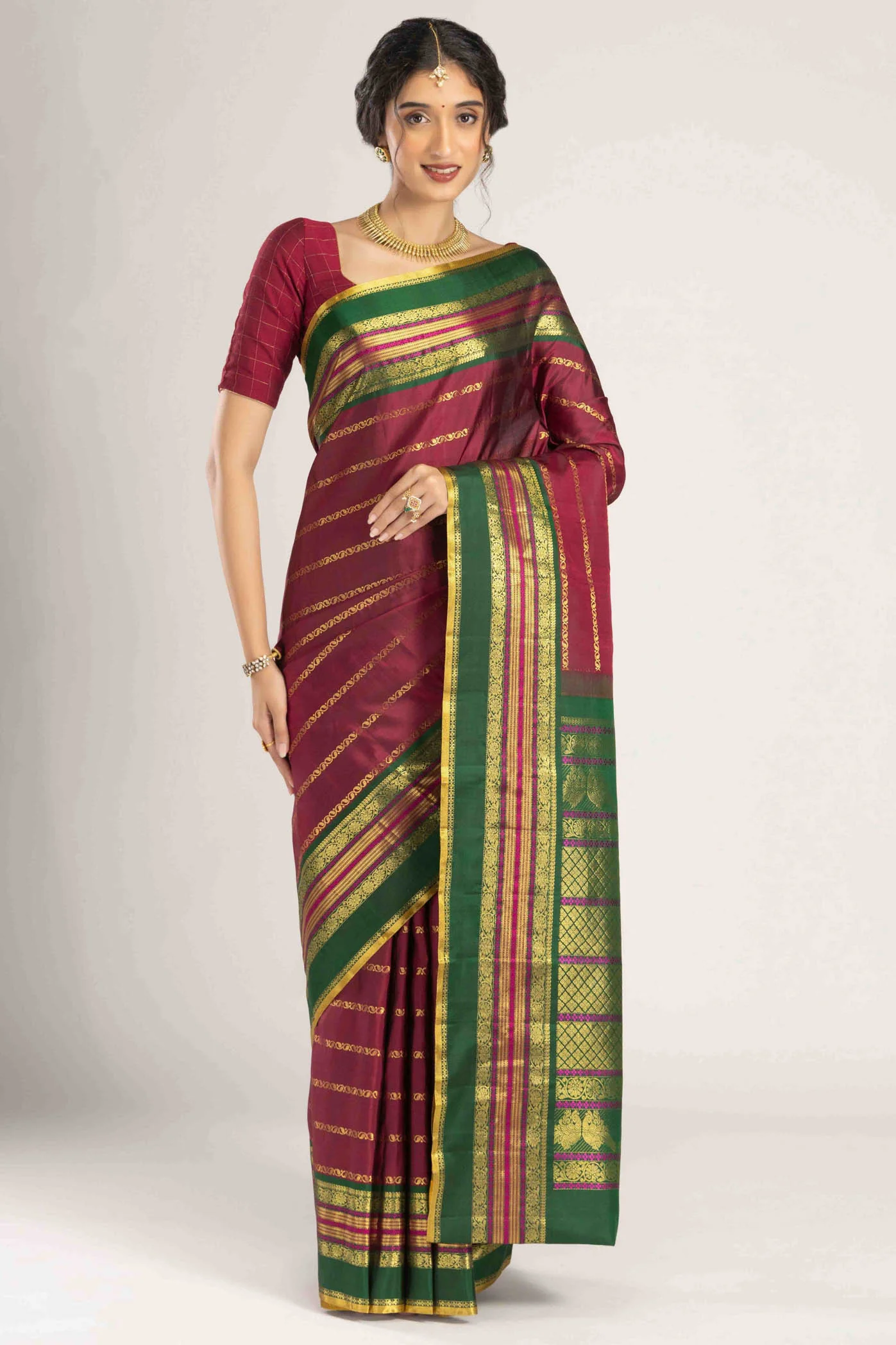 Shobha silk saree features golden veldhari leaves adorning pure mulberry silk. Broad borders showcase kamalam motifs in complementary hues. The pallu displays intricate ghetti bands with twin peacocks and kamalam patterns. Handwoven with exquisite zari craftsmanship.